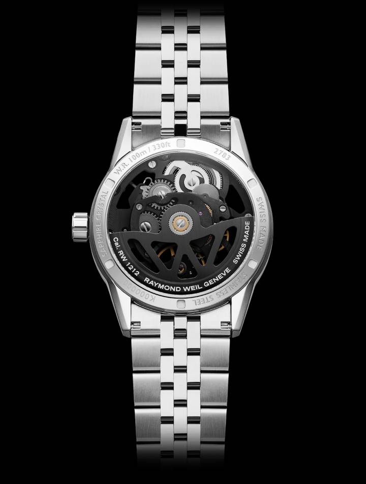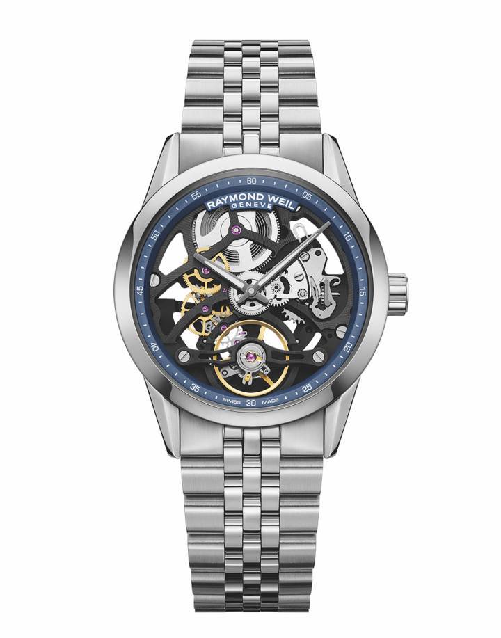 l compromiso de la marca con la innovación se evidencia en la esfera calada, que atrae la atención hacia el volante a las 6 en punto, revelando la intrincada belleza de la construcción del reloj y subrayando la maestría de Raymond Weil en la relojería.