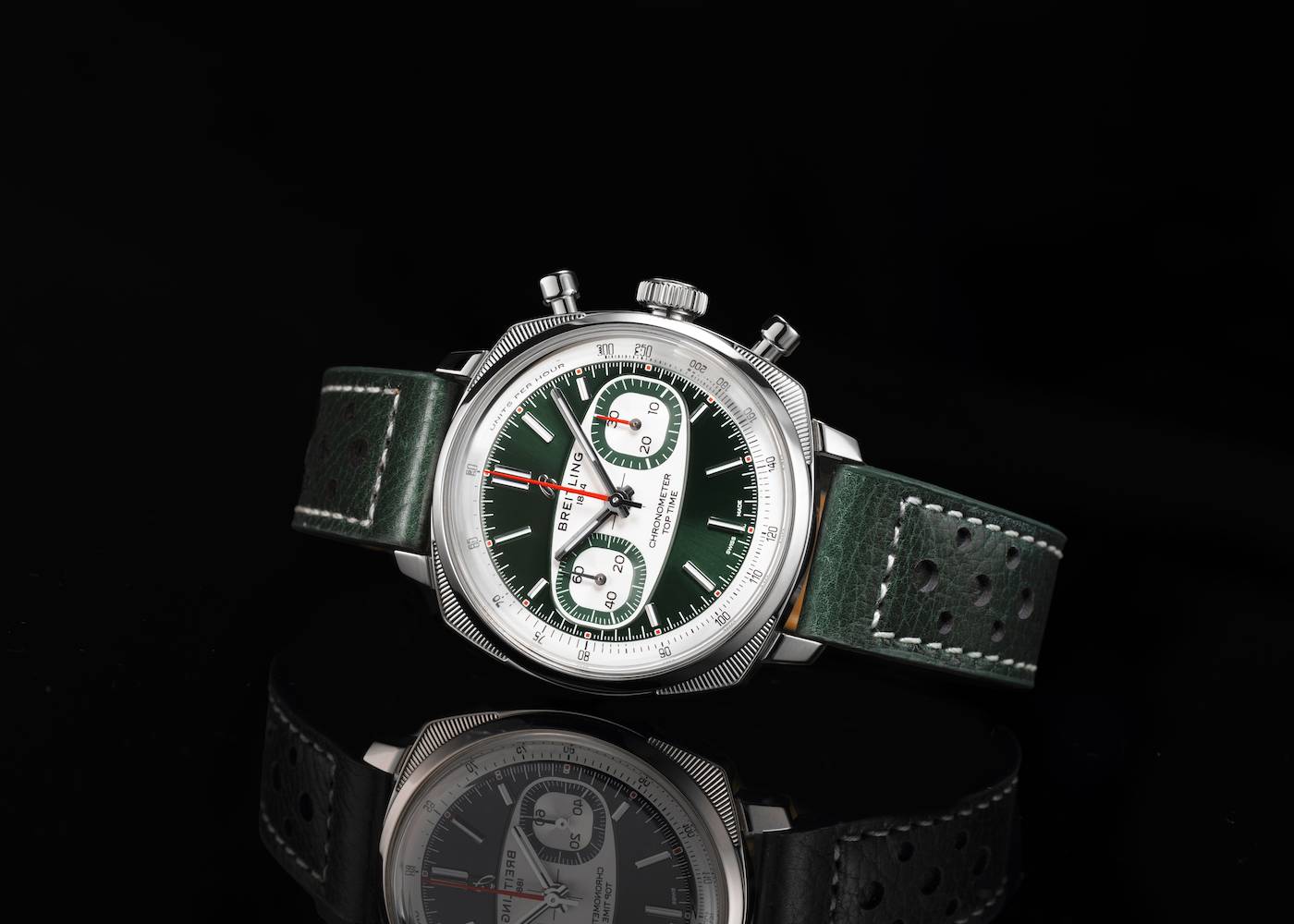 Cada edición Top Time Racing está limitada a tan solo 750 ejemplares, con un grabado especial “One of 750” en el fondo de la caja. Están disponibles en dos dinámicas combinaciones de colores: una esfera en blanco y negro con correa de piel beige, o una esfera en blanco y verde con correa de piel perforada verde a juego, que evoca los guantes de conducir clásicos.
