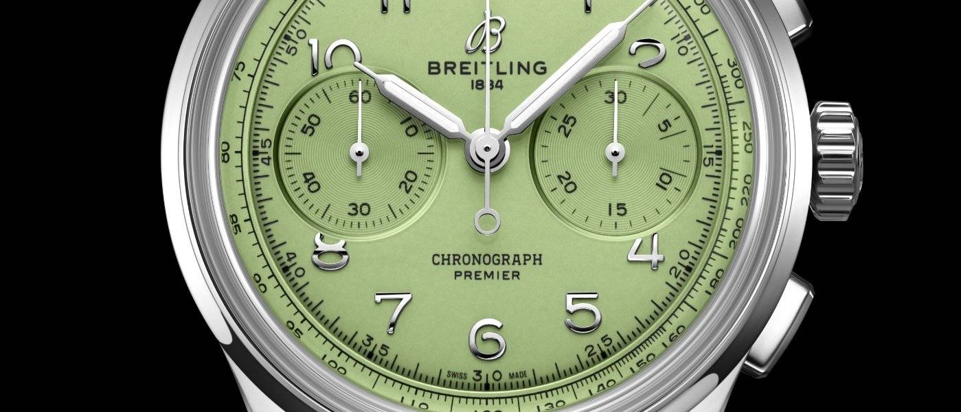 El cronógrafo Premier Heritage de 40 mm se carga manualmente, al igual que sus predecesores de la década de 1940. Está impulsado por el calibre de la manufactura Breitling B09, que se basa en el calibre de manufactura 01 de Breitling. Se presenta en dos variantes: con una llamativa esfera verde pistacho encerrada en acero inoxidable o una majestuosa esfera plateada encerrada en 18 k oro rojo.