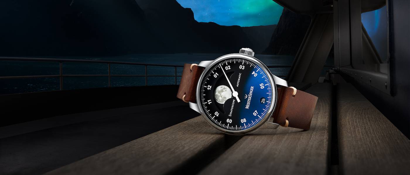 En su tercio inferior, la esfera de color negro azabache se funde en un espectáculo de luz brillante en diferentes tonos de azul, que recuerdan a la aurora boreal visible en el extremo norte. Y por encima de este espectáculo la luna luminiscente rodea la tierra. La escena única se transforma en un juego de luces mediante los marcadores horarios, que también brillan, y el indicador luminoso en forma de aguja. Los numerales de dos dígitos tan típicos de MeisterSinger están dispuestos en un círculo del 01 al 12 alrededor de la esfera, lo que refuerza la impresión de armonía y equilibrio. A pesar de toda esta atención al detalle, el reloj tiene una apariencia nítida y ordenada.