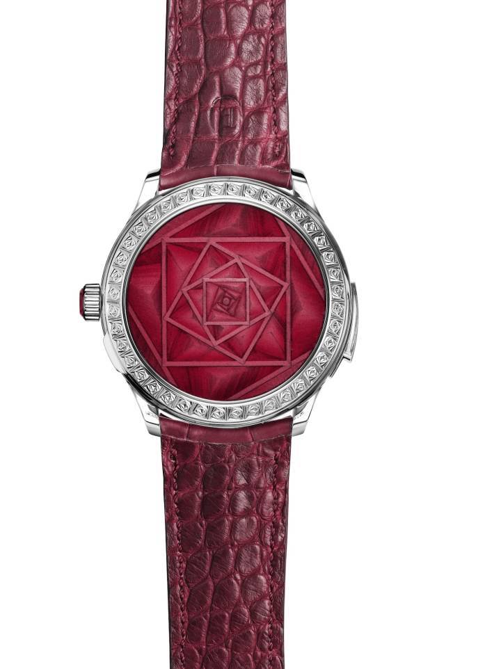 En esta ejecución, la caja del reloj está montada sobre una correa de piel de aligátor roja cosida a mano, cuyo reverso también es de piel de aligátor. Con un diámetro de 42 mm, la caja está tallada en bloques de oro blanco. El bisel, las asas y el canto están grabados a mano con el motivo La Rose Carrée. Estas muescas están grabadas con un cincel en las superficies duras del metal, una dentro de otra en una progresión algorítmica. Este trabajo requiere una precisión extrema, una inversión de tiempo impresionante y una mano firme que está garantizada por años de experiencia.