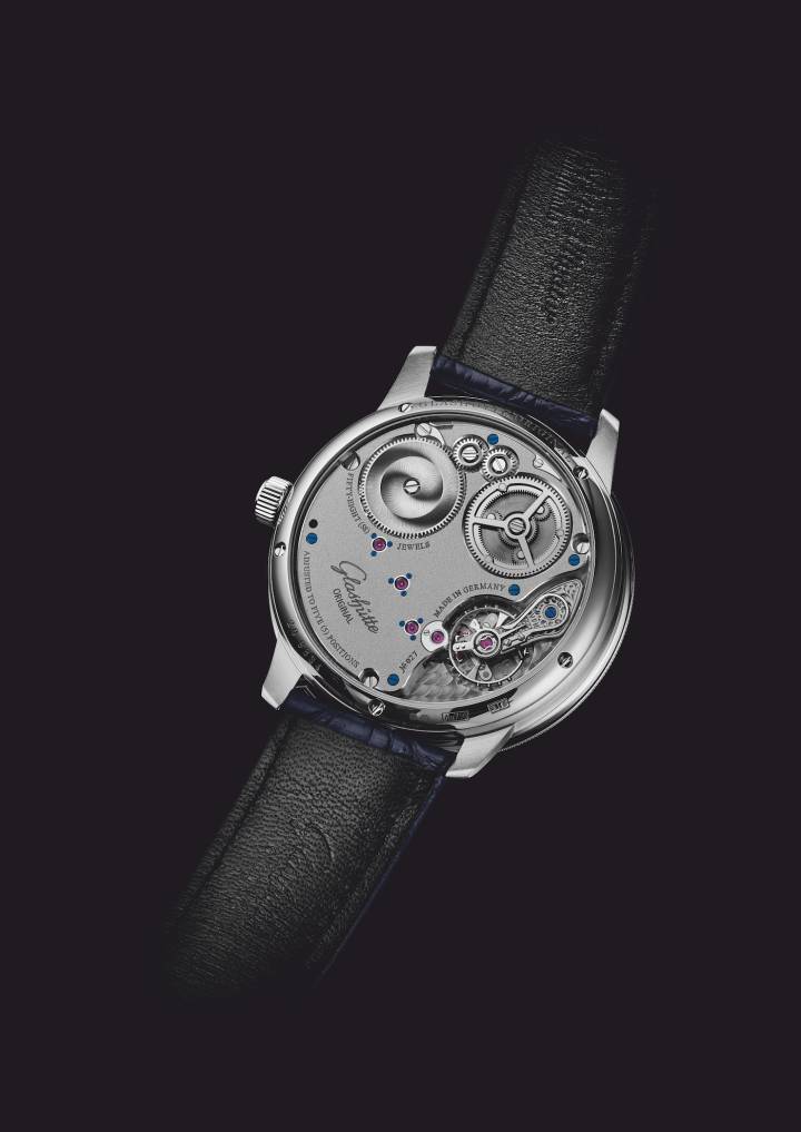 El calibre de cuerda manual 58-08 también es una delicia para la vista. A través del fondo de caja de cristal de zafiro, se pueden reconocer fácilmente las características clásicas y finamente acabadas del arte de la relojería de Glashütte: la característica platina de tres cuartos, los chatones de oro atornillados y el volante grabado a mano.