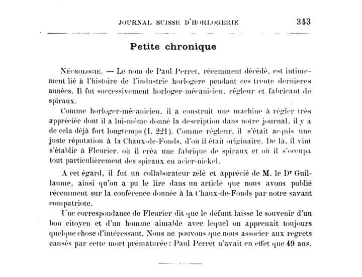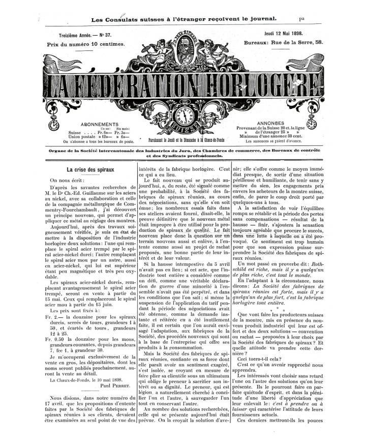 - El anuncio de Paul Perret sobre los resortes de volante Invar. FH (1898). Perret logró convencer a los asistentes de que los volantes Invar no sólo podrían reemplazar a los resortes de acero del cartel, sino que también podrían permitir que volantes simples alcanzaran un rendimiento a nivel de cronómetro. Pero del encuentro también surgió el compromiso de crear la Société Suisse des Spiraux, una fábrica para producir resortes de acero convencionales.