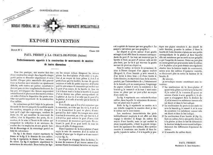 Pero la Revolución Industrial en Inglaterra y Estados Unidos finalmente obligó a los Suizos a adaptarse. Ciudades como Saint-Imier, Bienne, Grenchen y Tavannes estaban dispuestas a permitir grandes fábricas si eso generaba industria y empleo. Y la aplicación de patentes extranjeras en Suiza pone en desventaja a los inventores locales. El 29 de Junio de 1888, la ley Suiza estableció un sistema de patentes y el 15 de Noviembre se abrió una oficina de patentes en Berna. Paul Perret estaba extasiado y llegó la noche anterior para asegurarse de ser el primero en la fila. ¡Finalmente registró 5 de las 120 solicitudes de patente recibidas ese primer día!