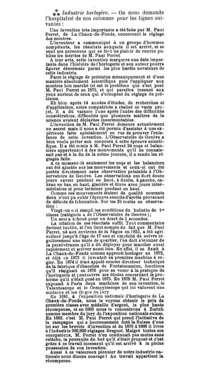 El 28 de junio de 1889 se publicó un relato anónimo en los periódicos de ciudades y pueblos clave de las regiones relojeras Suizas. La carta, que califica a Paul Perret como “uno de los innovadores más audaces de esta industria”, decía que su invento secreto eliminaría el tiempo y la habilidad necesarios para regular el volante y el resorte de un reloj. Es natural desconfiar del cambio, especialmente cuando amenaza el sustento de las personas y altera las prácticas establecidas. Así que no sorprende que la carta de Perret fuera recibida con un desprecio y una furia inusuales.