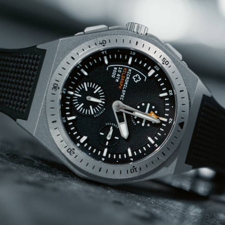 Fundada en 2019, esta marca se especializa en relojes mecánicos robustos diseñados para la acción y hechos a medida para las fuerzas especiales. Este año, presentaron el Micromilspec Milgraph, un reloj disponible para el público, que presenta dos complicaciones útiles: un cronógrafo y un GMT. El diseño de inspiración militar tiene una corona a la izquierda para una mayor movilidad y comodidad. La caja de 42 mm está hecha de titanio de grado 5 microgranallado para evitar reflejos durante misiones críticas. El nuevo bisel QuadGrip, marcado por cuatro hendiduras profundas, garantiza un funcionamiento suave incluso con guantes. El reloj es resistente al agua hasta 100 m y cuenta con una aguja GMT con punta de color naranja brillante. Está impulsado por un movimiento cronógrafo/GMT La Joux-Perret L121 con rueda de pilares, que ofrece una reserva de marcha de 60 horas. Edición limitada de 50 piezas. $$