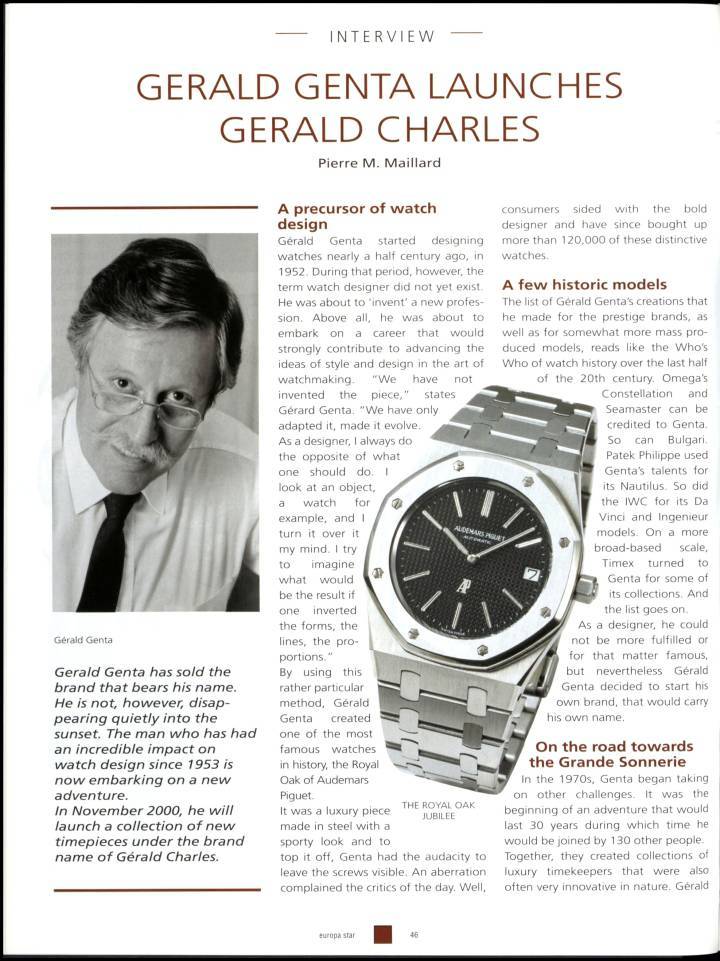 ara empezar, una anécdota: cuando me incorporé a Europa Star en 2014, me sumergí rápidamente en los archivos de nuestra publicación familiar. A lo largo de la década de 2000, una marca aparecía constantemente en artículos y anuncios. ¿Quién era ese Gerald Charles? Curioso, investigué más a fondo y descubrí que se trataba del último proyecto de Gérald Charles Genta.