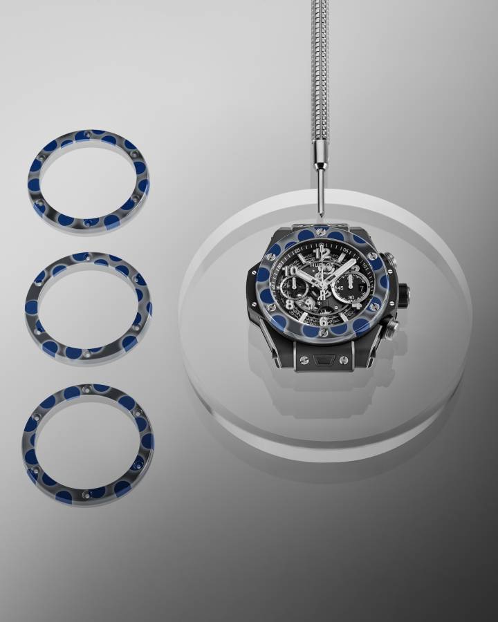 - Este año, Hublot presentó una innovación que tardó varios años en desarrollarse: el reloj de cerámica multicolor bautizado como «Magic Ceramic». El bisel de cerámica gris oscuro del Big Bang Unico Magic Ceramic está cubierto de círculos de un azul intenso dispuestos en un patrón orgánico y aparentemente aleatorio.