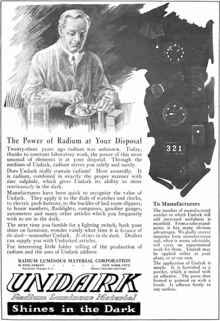 Este nuevo material fue percibido en el primer cuarto del siglo XIX como una revolución y utilizado en diversos campos. Altamente peligroso, la sustancia radioactiva recibió erróneamente la atribución de varias virtudes. En los años 30, se podía encontrar el radio en polvos de belleza, pasta de dientes, ropa interior de esquí, alimentos para animales o incluso condones. En ese momento se sabía poco sobre la radioactividad y su efecto sobre los órganos humanos.