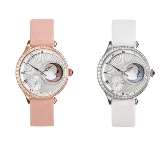 Con el Lucea Moon Phases, Bulgari juega con formas, materiales y colores con toda sutileza. La luna, montada sobre un disco engastado con rubíes o aventurinas, pasa de una fase a otra en una abertura tallada en una esfera de nácar. Los diamantes de talla brillante se colocan como marcadores horarios y otros 45 también adornan el bisel de oro, que se realza con una corona de cabujón con una piedra preciosa rosa con punta de diamante.