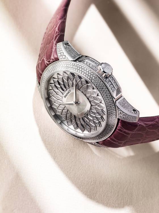 La Sirène de Ateliers de Monaco fue creada en 2009 para la princesa Charlene de Mónaco utilizando piedras de topacio azul claro incrustadas en las hojas de la King Protea, la flor nacional de Sudáfrica, que se representa en la esfera. Ahora Ateliers de Monaco ha ampliado la colección con dos nuevos modelos, La Sirène Diamant y La Sirène Rubis. Aquí se ve la versión totalmente de diamantes en oro blanco con un total de 737 diamantes (3,06 quilates) engastados en la caja, la corona, el bisel y la esfera de nácar. Impulsado por el calibre dMc-700 automático propio con un rotor de oro de 22 quilates grabado con el escudo del principado de Mónaco, La Sirène irradia elegancia refinada con su lujosa e impresionante esfera y caja engastadas con diamantes, lo que subraya el deseo de la marca de crear relojes icónicos.