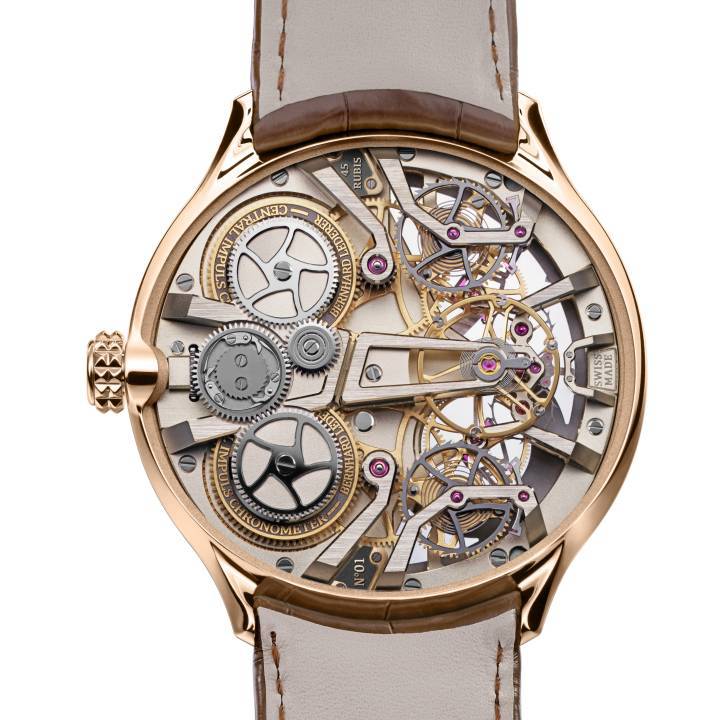 Su Central Impulse Chronometer, fruto de varios años de reflexión y desarrollo, está compuesto por dos ruedas de escape que funcionan en alternancia y están conectadas a una horquilla de palés que es “absolutamente única, un verdadero metrónomo para relojes”, en términos de su perfil, sus rubíes, sus ángulos de elevación y la forma en que entra en contacto con los componentes que guía, con tanta ligereza y suavidad que es prácticamente silencioso.
