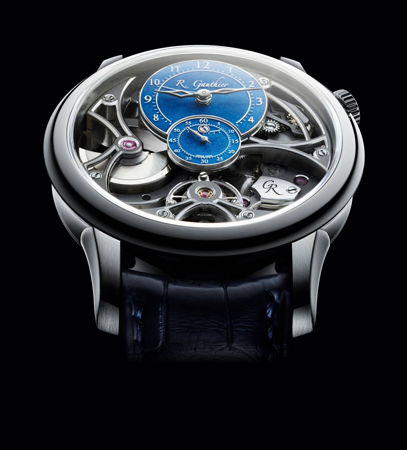 El movimiento esqueletizado es el Micro-Rotor, el prestigioso movimiento automático de Romain Gauthier con un micro-rotor tallado en oro de 22 quilates, que da cuerda a un doble cilindro de barrilete que proporciona una reserva de marcha de 80 horas.