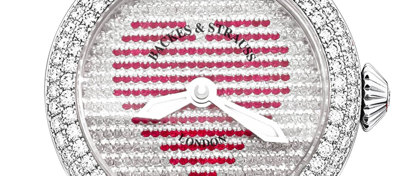 Backes & Strauss presenta una serie de relojes de oro blanco, cuyas esferas están engastadas con diamantes blancos Ideal Cut y rubíes rojos. Desde un ángulo, se ve una esfera pavéset completamente blanca, mientras que desde una perspectiva diferente, la esfera revela un corazón rojo hecho de rubíes rojos. Disponible en dos tamaños (cuarzo 33 mm y automático 37 mm).