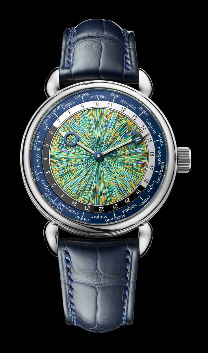 Pero la belleza de la esfera sería irrelevante sin su contexto. Es como si el tiempo mismo, con toda su energía frenética, brotara del origen central de las manecillas, animando el movimiento circular de la esfera de la hora mundial. Es tan exquisito de mirar como poético de contemplar. Es verdaderamente una obra de arte.