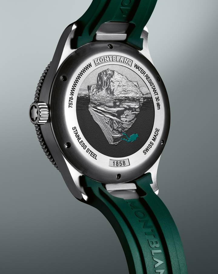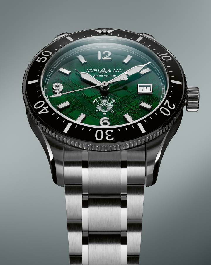 Montblanc lanzó recientemente una edición boutique con una esfera verde esmeralda (el hielo puede aparecer verde debido a los óxidos de hierro atrapados en él), un bisel de cerámica negra y, en el reverso, un alivio en 3D de un buzo, esta vez en verde y adentro Un tamaño mayor que en la colección regular. “Todo tiene un significado”, continúa LeCamp. “Este grabado, oculto en la parte posterior, ilustra todas las cosas que nunca imaginó que existieron pero que se pueden encontrar debajo de capas de hielo. La idea se le ocurrió mientras se zambulló en el lago Baikal en Rusia. Un inglés le dio el nombre de Mer de Glace al glaciar Mont Blanc. Tenía un sentido que deberíamos usarlo como inspiración para nuestro reloj de buceo”.